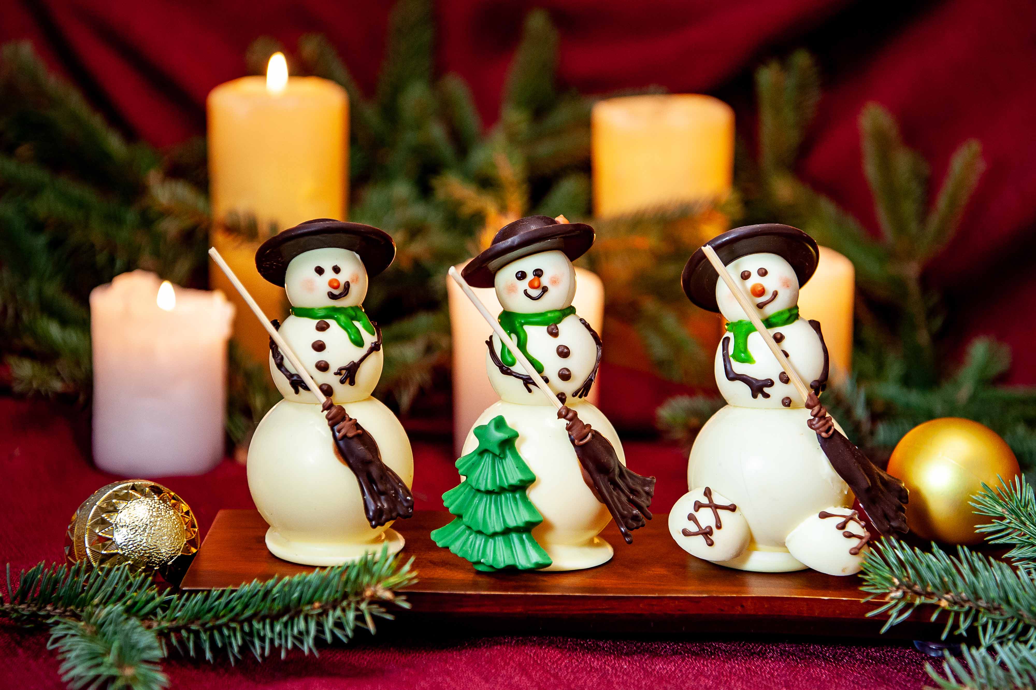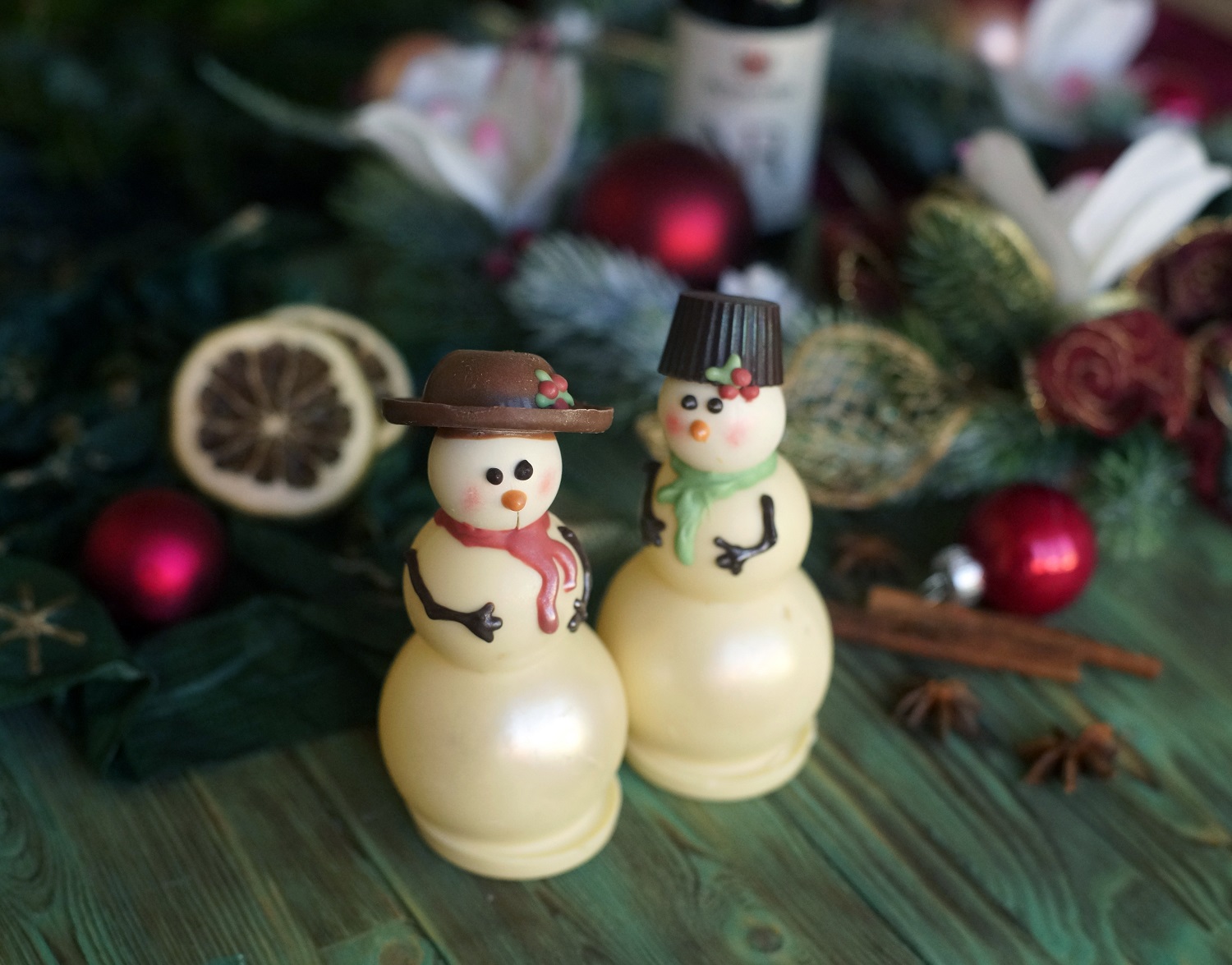 Снеговик из белого шоколада с элементами из темного и иолочного шоколада. Внутри нижнего шара - шоколадные дражже и конфетки!