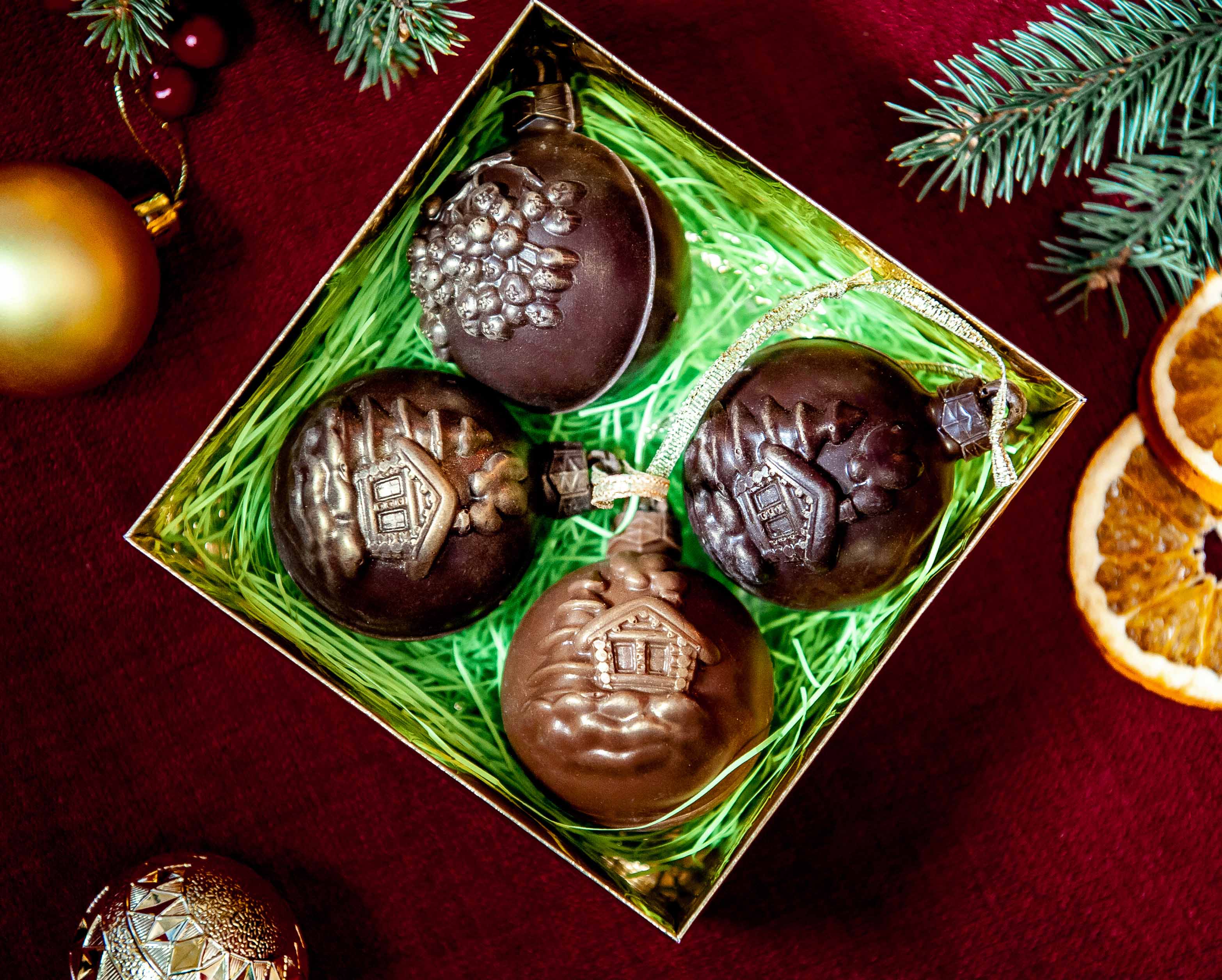 Набор из четырех елочных шаров (молочный или темный шоколад)