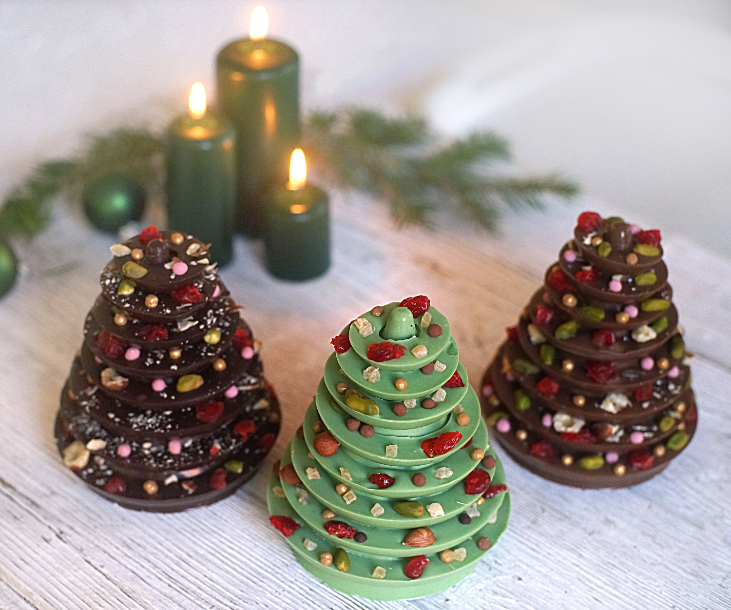 Шоколадная елочка с колечками из темного, молочного или зеленого шоколада со вкусом лимона, с орешками, цукатами, шариками крисп.