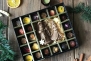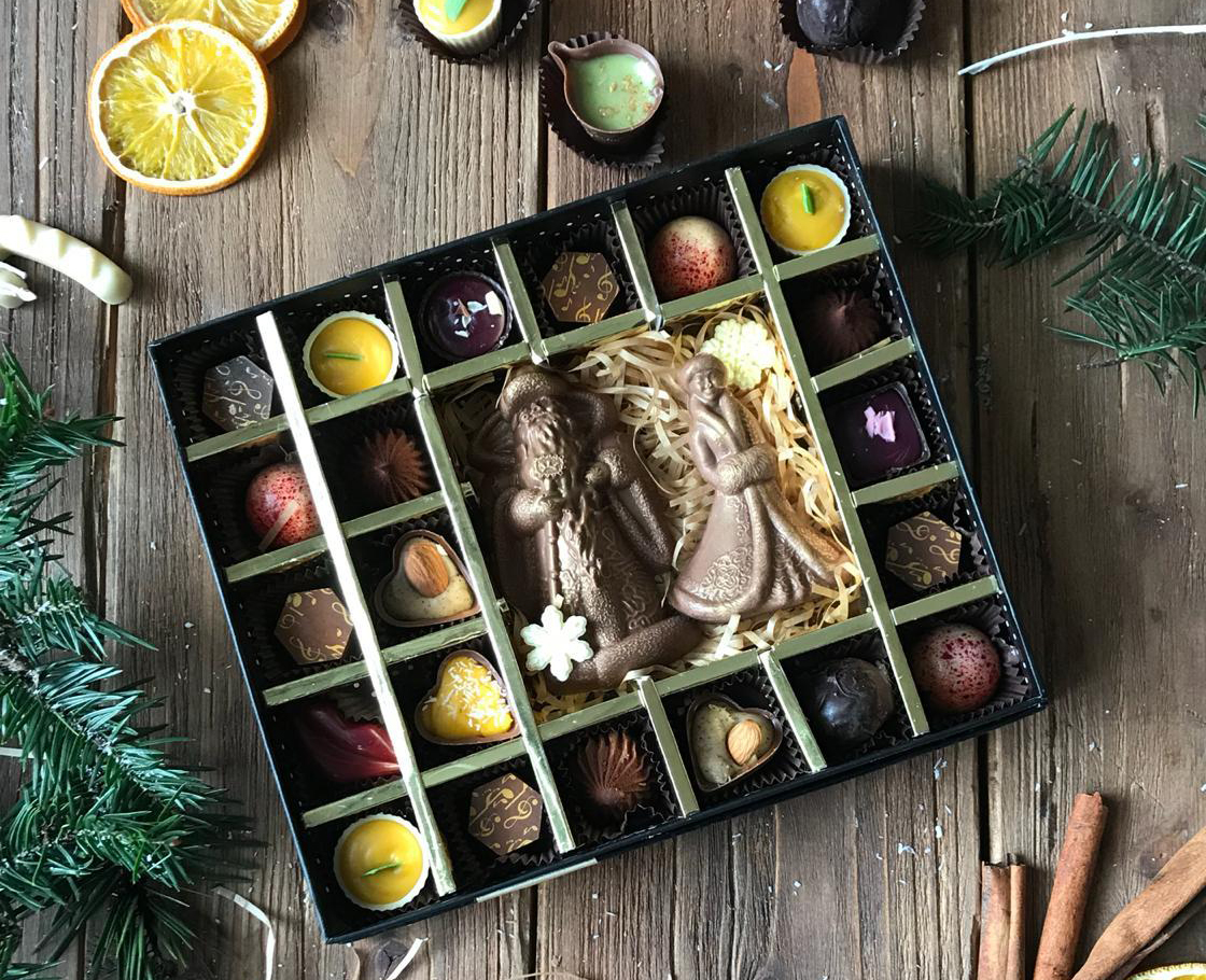 - ассорти из 21 Конфеты ручной работы Зимней коллекции; - фигурка Деда Мороза и Снегурочки из темного или молочного шоколада (на выбор).