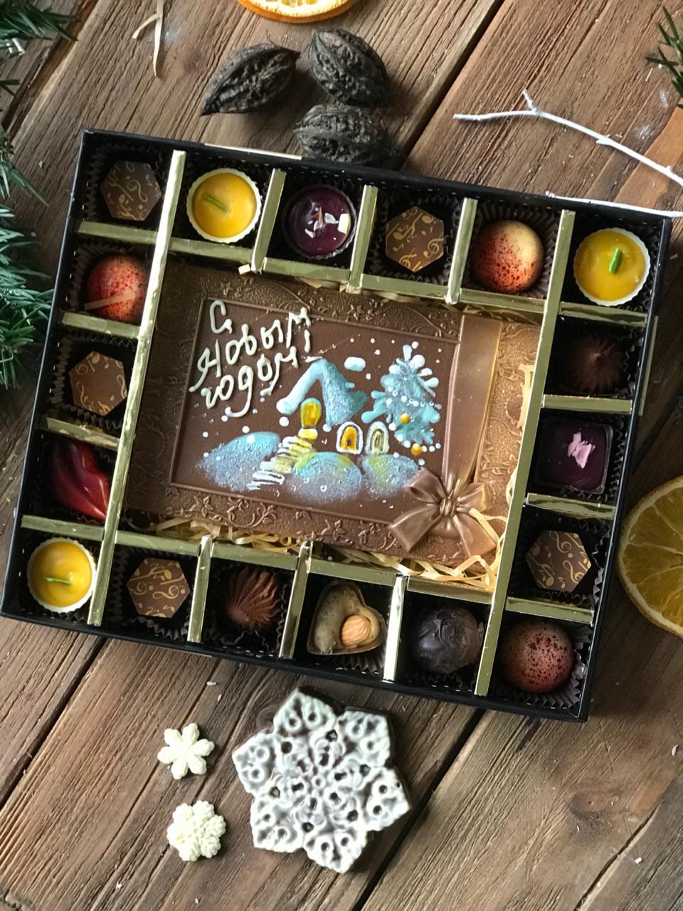 - ассорти из 18 Конфет ручной работы из Зимней коллекции; - открытка с росписью из темного или молочного шоколада (на выбор).