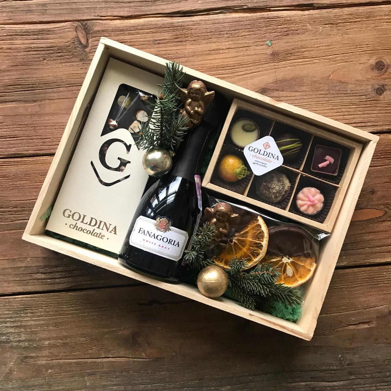Подарочный набор в крафтовой коробке: - плитка шоколада 120 гр; - ассорти 6 конфет в коробочке Крафт; - апельсины в шоколаде 100 гр; - новогодний декор. Стоимость указана без шампанского.