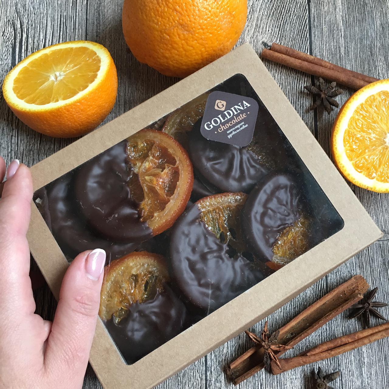 Дольки апельсинов сварены в пряном сиропе, высушены и покрыты темным шоколадом.