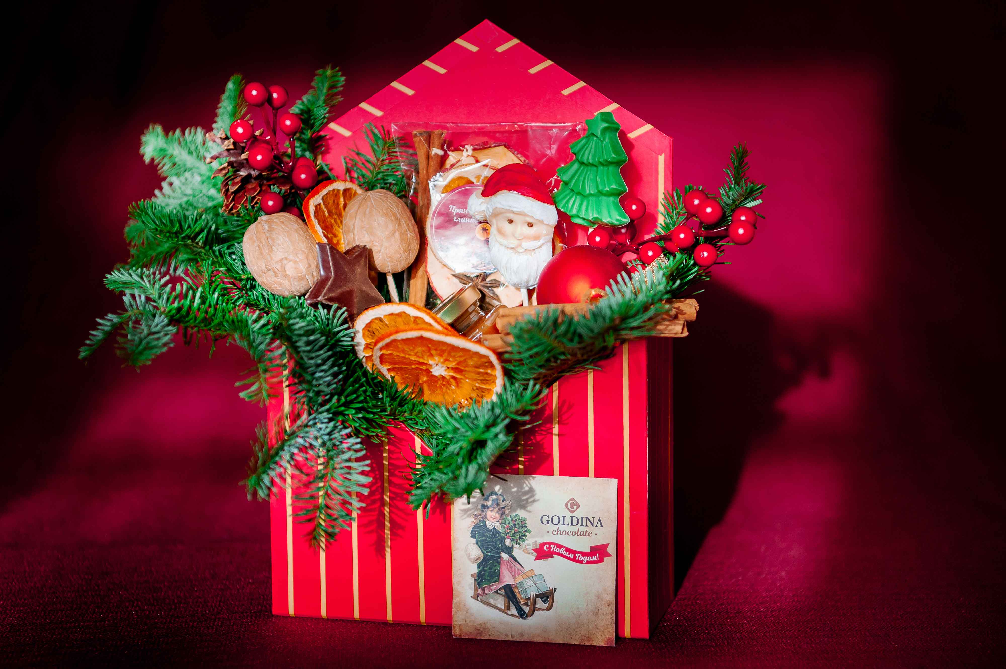 Вам письмо! Подарочный конверт с шоколадными фигурками, хвоей, новогодним декором.