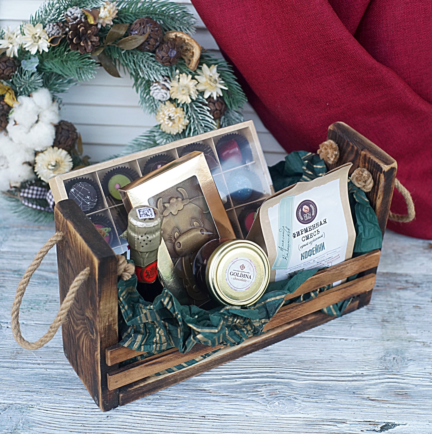 15 конфет ручной работы, плитка шоколада с символом года, отличный зерновой кофе (250 гр), баночка карамели 100 гр, мини-шампанское , и все это - в ящике ручной работы из натурального дерева!