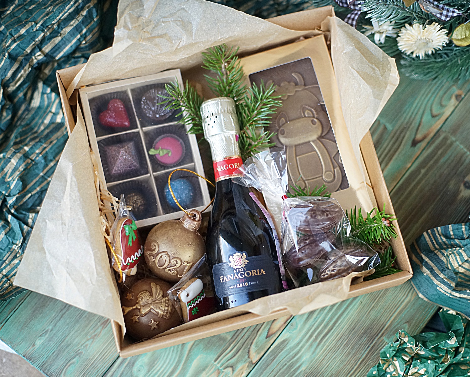 Мини-шампанское, плитка из бельгийского шоколада с бычком, два шоколадных шарика на елку, три орешка с пожеланиями, набор из 6 конфеток ассорти, имбирные пряники 2 шт, хвойный декор.