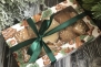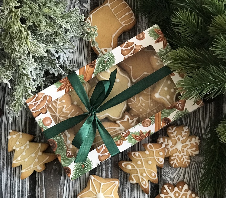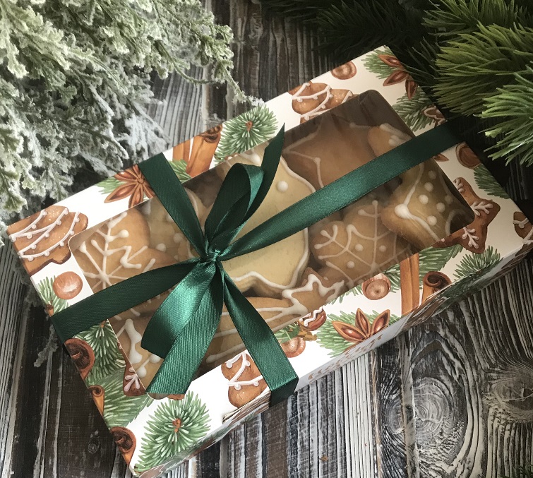 Упаковка 250 гр . Коробочка с новогодним принтом и нарядной лентой.