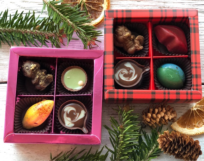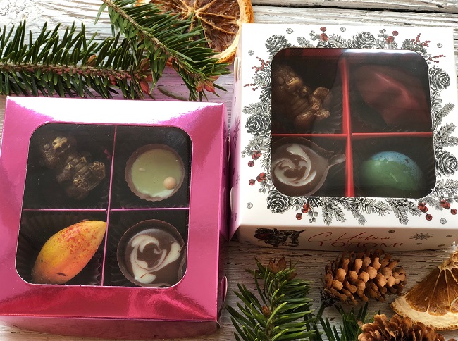 Коробочка с 3 конфетами ручной работы и шоколадным дракончиком.