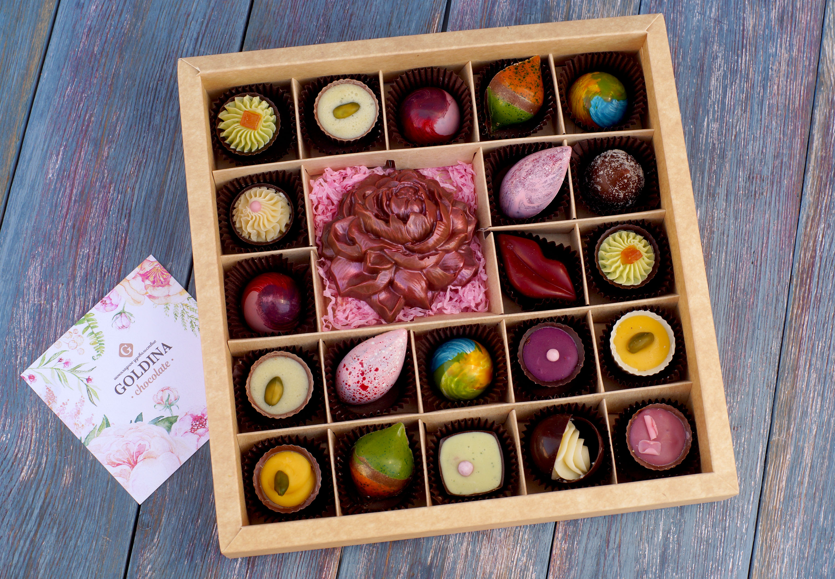 Ассорти из конфет ручной работы и шоколадная фигурка. Упаковка - коробочка крафт, перевязанная атласной лентой.