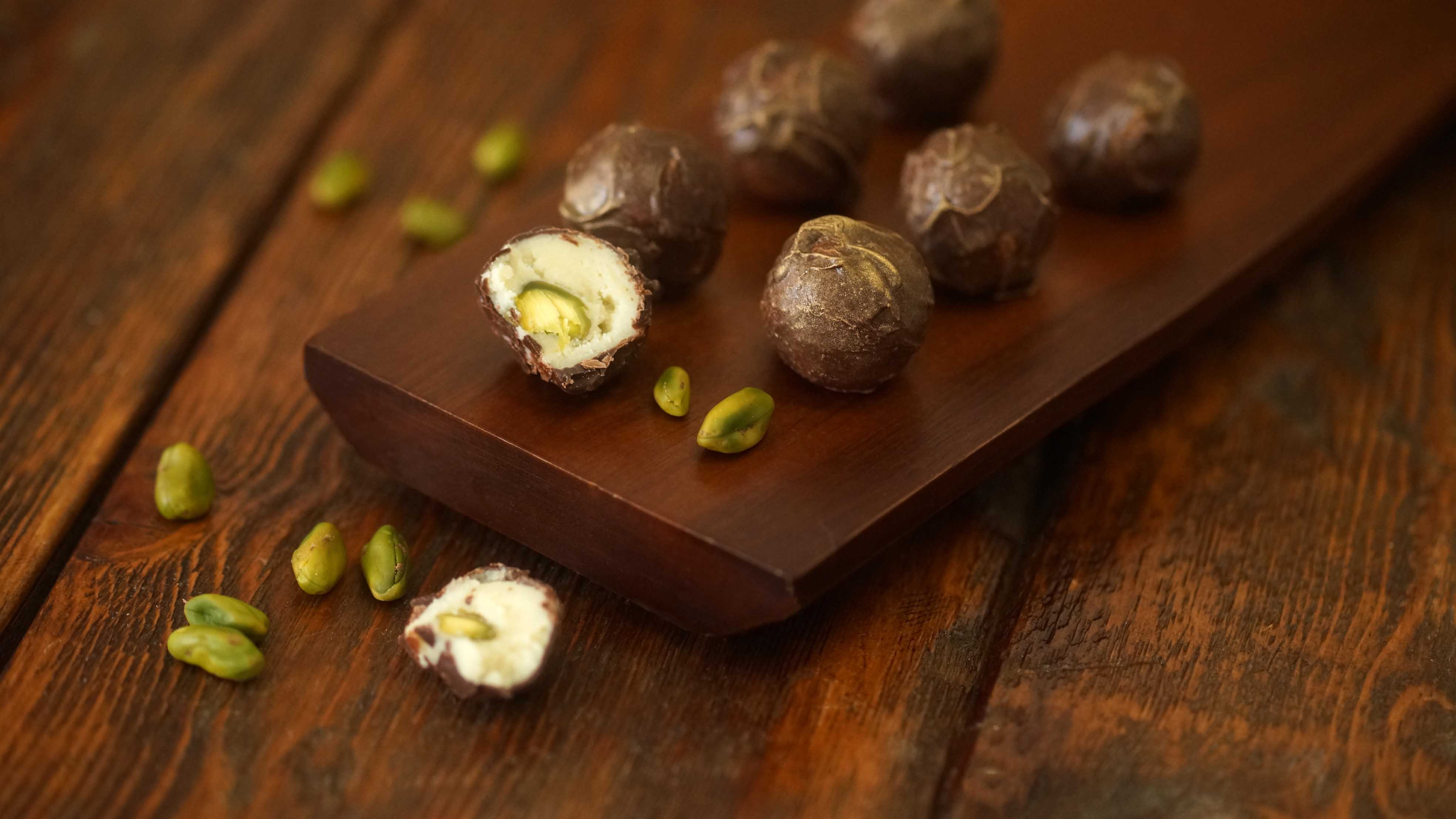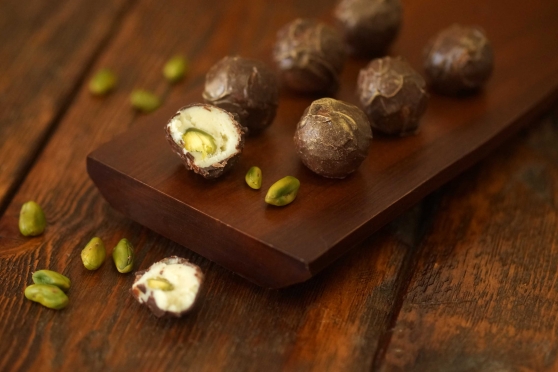 Трюфель Дор-Блю. В этой конфете встретился сыр с голубой плесенью, белый шоколад и фисташка. Покрыт тёмным шоколадом.