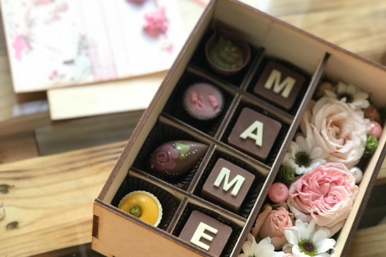 Нежная цветочная композиция с 8 конфетами ручной работы в деревянной коробке.