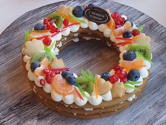Торт-медовик в виде евеночка, украшенного свежими фруктами, ягодами и шоколадной табличой "С Новым годом!"